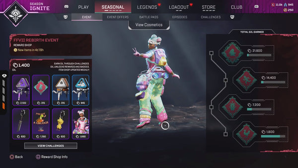You can also earn items for free just by playing the game mode and completing challenges to earn Gil. You can earn up to 1800 Gil per day by completing event challenges and playing the game mode. You will earn free badges for acquiring Gil and you can also spend it on exclusive event items and even Event Packs, so you can save your Apex Coins and Crafting Materials for unlocking Legends or other cosmetics!