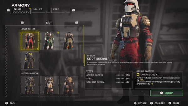 Armor in Helldivers II come in 3 strengths, Light, Medium, and Heavy. Each armor has a stat for Armor Rating, Speed, and Stamina Regen. Heavy armor will generally have a higher armor rating and lower speed and stamina regen, and vice versa for light armor. We recommend Light Armor for almost every mission, because the movement in Helldivers II can seem a little slow and unforgiving at times. When you’re trying to outmaneuver a rampaging Charger, you’ll want that extra speed, and it will cut down on time spent traversing the map for resources and objectives.