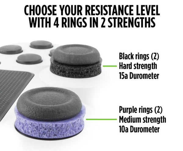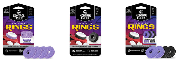 KontrolFreek Precision Rings come in two strengths: hard and medium. The strengths, measured in durometers (measures a material's resistance to permanent indentation), allows you to customize your resistance level. Our original black rings are hard strength for the most resistance possible, and our new purple rings are medium strength for added flexibility. Precision Rings will fit on any controller, including PlayStation, Xbox, and Switch.