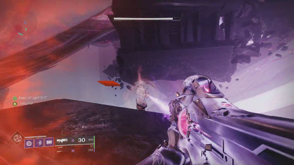 Once you reach the raid banner, stop and gather your team before moving forward. In this encounter, 2 runners will be using a similar mechanic to the runner(s) in the last encounter, but this time one of the runners will be grabbing a light orb and buff and the other runner will be grabbing a dark orb and buff. Standing in the glowing orange aura and shooting the orb will give you and anyone next to you the “Flux of Darkness” buff. So split up into 2 teams, one on the dark orb side and one on the light orb side. To start the encounter, all 3 players on each side will stand in the aura, and the runner will shoot the orb to give everyone the corresponding buff and find out where their next orb is. You’ll see a timer for about a minute for the runners to finish their runs on each floor. Runners will need to use the launchpads to cross the chasm to get to their next orbs. While runners are getting their orbs, ad clearers will stay in or near the aura killing enemies. Eventually your runner will get back and need to reactive their buff. Ad clearers need to be standing in the aura with the runners every time they shoot the orb to get the buff, which you will need to be able to damage special enemies with the matching aura to your side. Once both runners have finished their runs, the timer will stop and a new launchpad will open up to launch the players on your side to the next floor. Rinse and repeat on two more floors. To put it lightly, these launch pads are…not the best. They will sometimes launch you perfectly, sometimes way short and you need to jump and other times you will bump a teammate and fly off a completely different direction. This can be very annoying, especially while on a timer. Our recommendation is to use jump or glide right after launching to extend your upward trajectory, but even with doing this, you can still launch into the wall and die. Runners can use a sword with eager edge to ensure they make it across safely